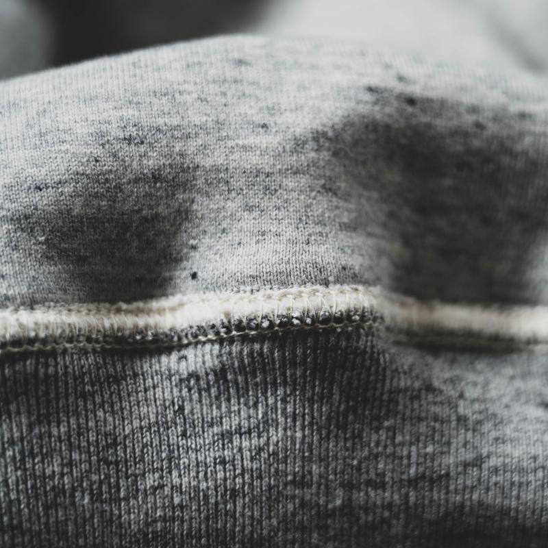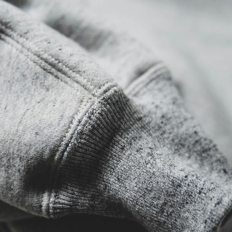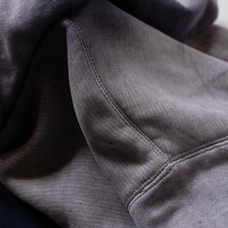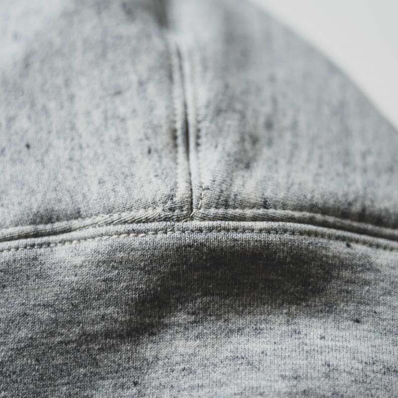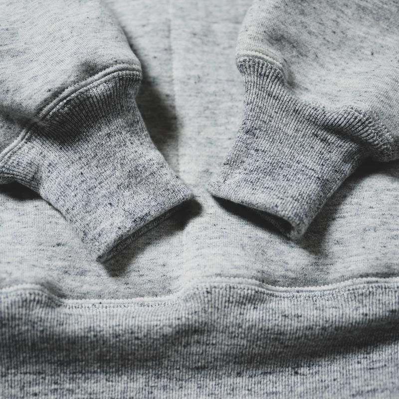 糸から作ったフルオリジナル。今回は糸番手を変更したので、2種類の糸を紡績しました。1本を2本にした本体の糸と、2本を1本にしたリブの糸。これはチャンス!だと思って黒の比率を変えました。念願だったツートーン。 まさに、キングオブフーディー!