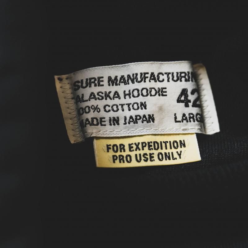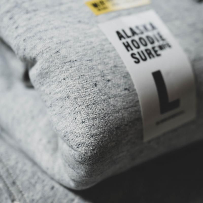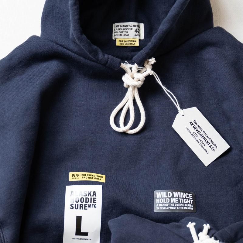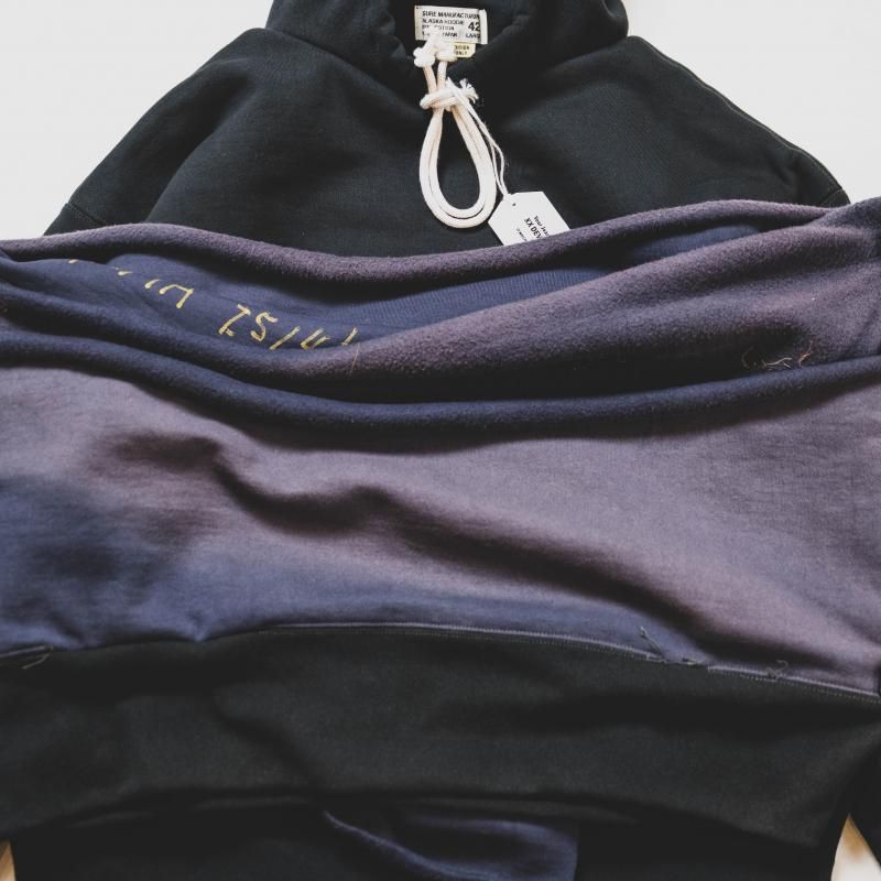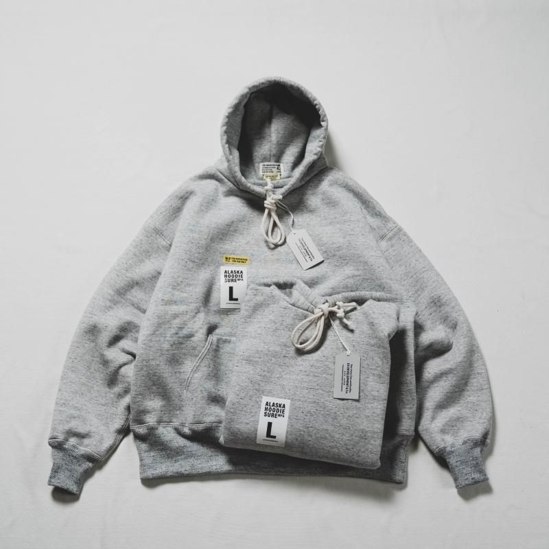 カラーについては、最初からフェードした感じに作るのはなんか違う気がしてて、染工所で聞いた 日光で青が抜けて赤が残るネイビー を採用しています。アラスカフーディーは、言ってしまえばアフターフーディーのレプリカです。でも僕たちが再現したいのは、ディテールだけじゃなくて、SUREがビンテージみたいに、誰かのお気に入りになって、ヨレヨレになって、ゾンビになって…それでも大好きだ。みたいな存在になることです。もし到達できたら…それは「ナイスナスビー」です。
